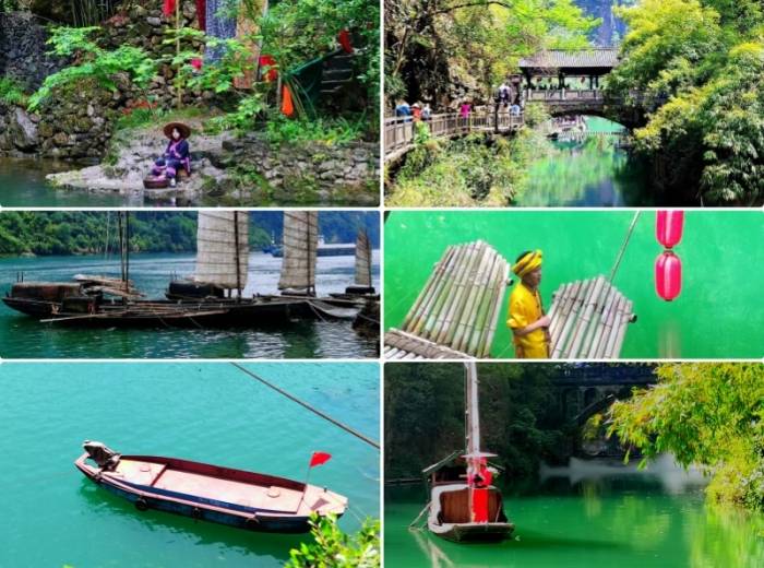 10:00/13:00——换乘三峡人家渡船抵达长江南岸三峡人家风景区【国家5A级景点】之龙进溪码头,开始游览有着湖北小九寨之称的三峡人家·龙进溪,一上码头,即可看到数艘古帆船靠岸而停,别具一番风味。过了检票口,映入眼帘的是清澈透明的溪水和土家渔船,甚是好看!更有土家幺妹、渔夫等土家特色人物在船上或站着或坐着~沿着溪边走去,还有一群大白鹅在清澈见底的河流里串戏!鱼儿在水中自由自在的游着,对岸立着大小各异的水车嘎嘎噶旋转不停,在溪边洗衣的土家菇凉唱着情歌寻情郎,仿佛进入了一片世外桃源!10:30班到达三峡人家后先吃饭,吃完饭后开始游览!