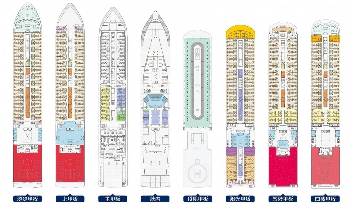 全船旅客及船员活动总面积 19000平方米,功能分布合理,旅客休息住宿区与公共娱乐区以中央接待大厅为分界完全独立。