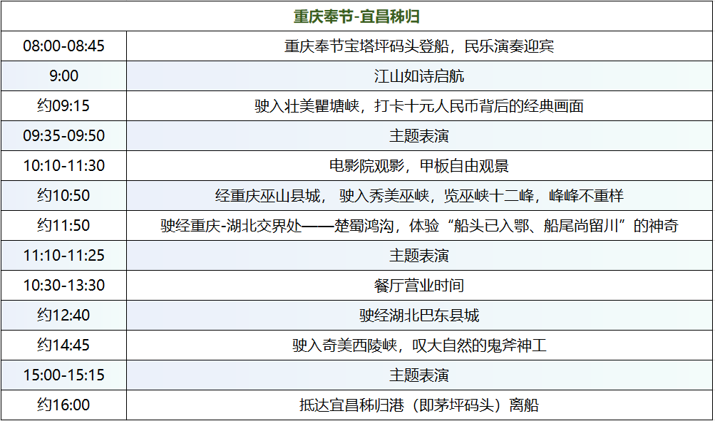 备注:根据季节、水位、天气、航道、政府禁令等情况,上述行程表中的到港时间、在船活动时间可能会有相应调整,请以游船当日行程为准。当日返程交通建议:奉节离船当日下午19:00以后高铁;秭归离船当日下午19:00以后高铁或20:00以后航班。