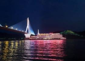 游轮开始夜游江上巡游,沐浴在微润的江风中,欣赏万家灯火灿烂星光,感受“一半山水一半城”独特魅力,游轮在宜万铁路大桥附近水域调头上行经夷陵古城城标天然塔,欣赏夜景灯光秀。