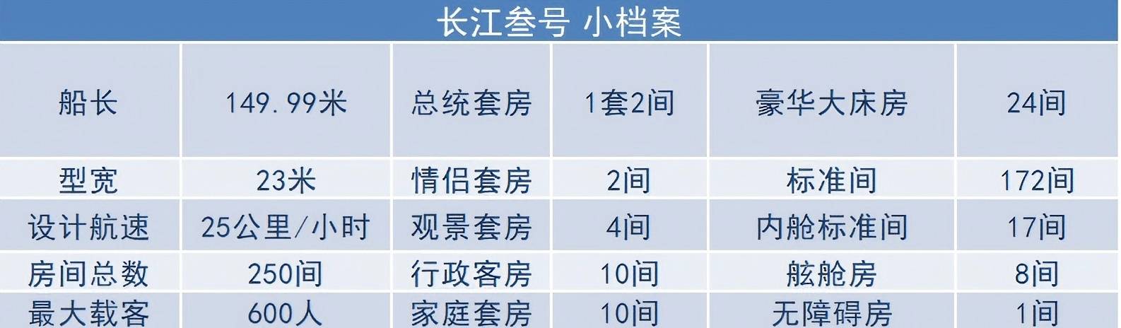 长江叁号轮共有8层甲板,拥有11种房型250间客房,其中总统套房2间、情侣套房2间、观景套房4间、行政客房、家庭套房各10间、豪华大床房24间、标准间172间(面积23.5m2)、内舱标准间17间、舷舱房8间、无障碍房1间。房间设计在简约实用的基础上,通过丰富的色彩搭配和软装构建,营造出多元的文化感受。