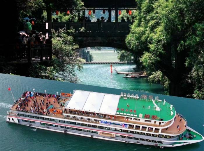 12:00- 15:00:景区自理午餐。下午游览龙津溪(龙溪桥、鹊桥、婚嫁楼表演、峡江号子、 迎宾表演)。