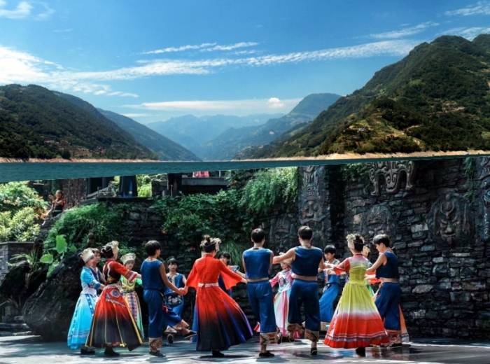 12:00- 17:00:换乘中转车前往胡金滩码头,渡船过江后游览山上人家(石令牌、 巴王宫、茶盐古道非遗传承一条街、巴王寨,三棵树广场观看演出),之后前往游览龙津溪(龙溪桥、鹊桥、婚嫁楼表演、峡江号子、 迎宾表演)。